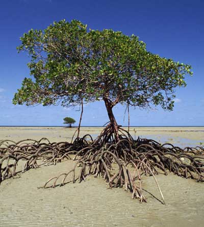Mangrove roots slow down the tidal water with the roots trapping the ocean sediment during the daily tidal cycle. In this way they stabilise land elevation by promoting sediment buildup in tidal areas. This filtering effect of mangrove forests also plays a vital role in protecting seagrass beds and coral reefs from damaging siltation.